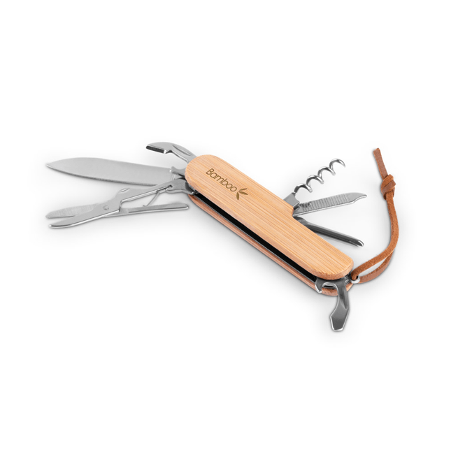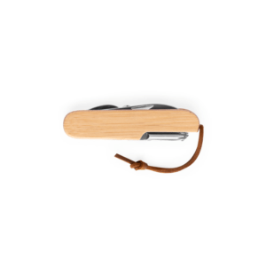Višenamjenski džepni nož od bambusa, oštrica od nehrđajućeg čelika i PU kabel za jednostavan transport i skladištenje. Sadrži 7 funkcija: oštricu, škare, vadičep, odvijač, otvarač za limenke i boce i turpiju za nokte. Isporučuje se u poklon kutiji od kraft papira. Budući da je proizvod izrađen od prirodnih materijala, boja te rezultat ispisa mogu se razlikovati od proizvoda do proizvoda. 94 x 24 x 15 mm | Kutija: 30 x 20 x 95 mm
