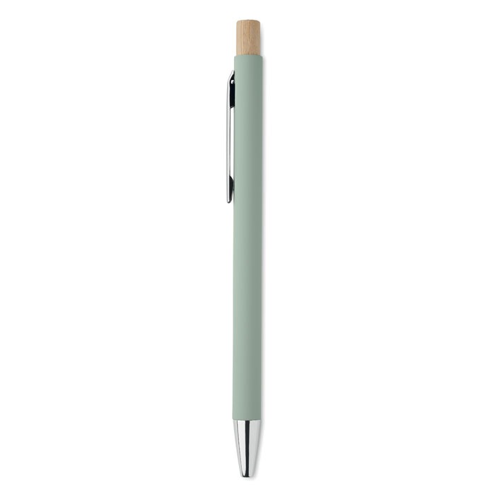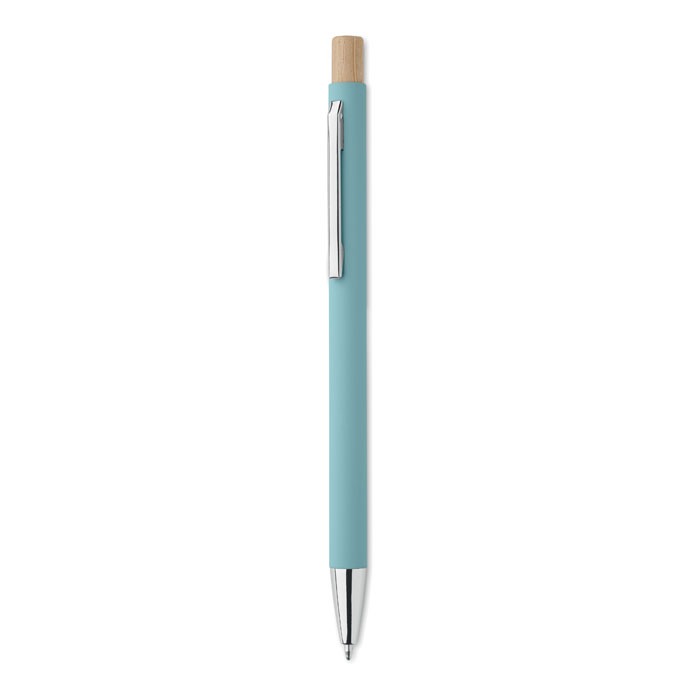 Kemijska olovka od recikliranog aluminija s bambusovim potisnim gumbom. Srebrni vrh i kopča. Plava tinta.