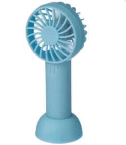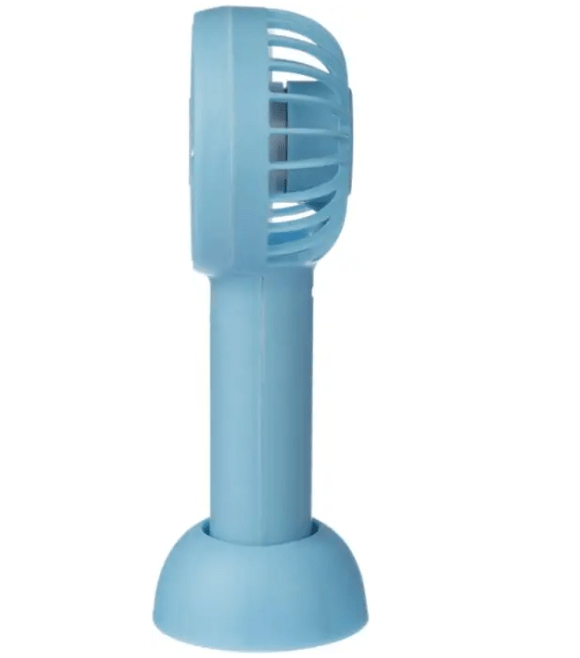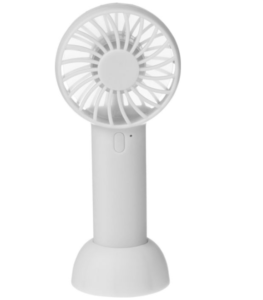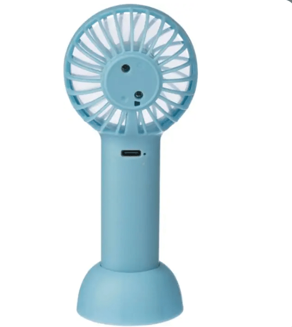 ABS električni ručni ventilator s baterijom od 600 mAh i Type-C priključkom za punjenje, uključujući kabel za punjenje, što omogućuje ponovno punjenje uređaja. Uključuje postolje za uspravno postavljanje te se može koristiti zasebno tijekom putovanja. Ventilator nudi tri brzine rada. Pojedinačno pakiran u smeđu kartonsku kutiju.