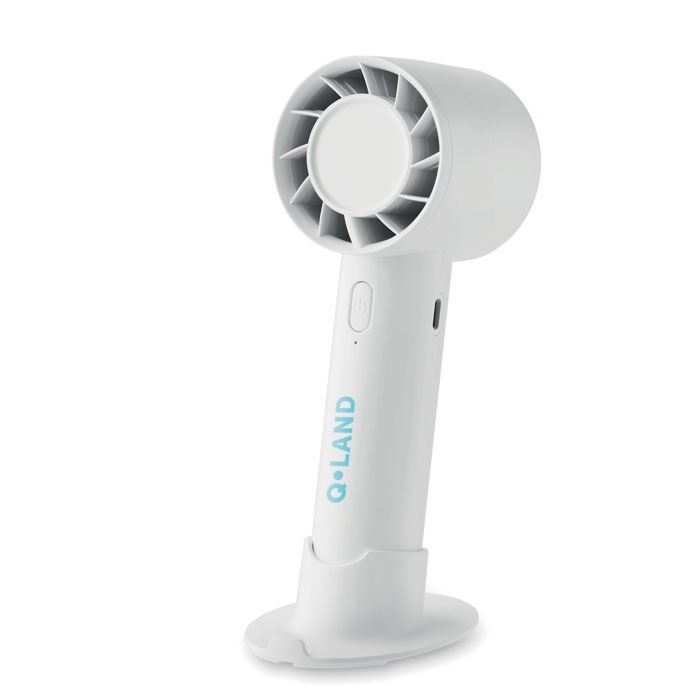 Mali prijenosni ventilator s dodatnim stolnim postoljem i mogućnošću držanja za telefon. 3 postavke brzine. Punjiva baterija s USB priključkom od 2000 mAh.