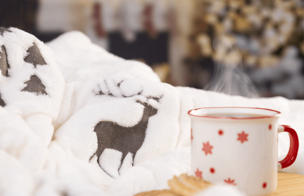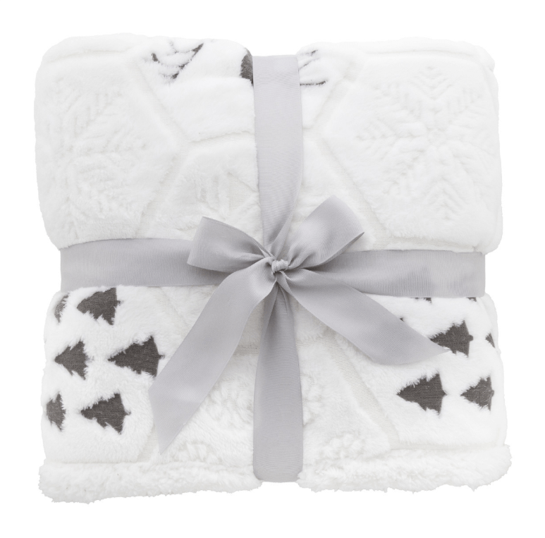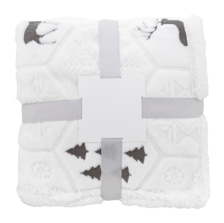 Luksuzna dvostruka RPET božićna deka s utisnutim zimskim uzorkom. Izrađena od 270 g/m² RPET flanelskog flisa i reverzibilne podstave od 210 g/m² RPET sherpa flisa. Umotana u vrpcu s karticom za ispis.
