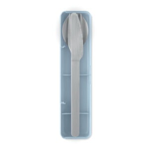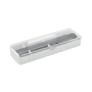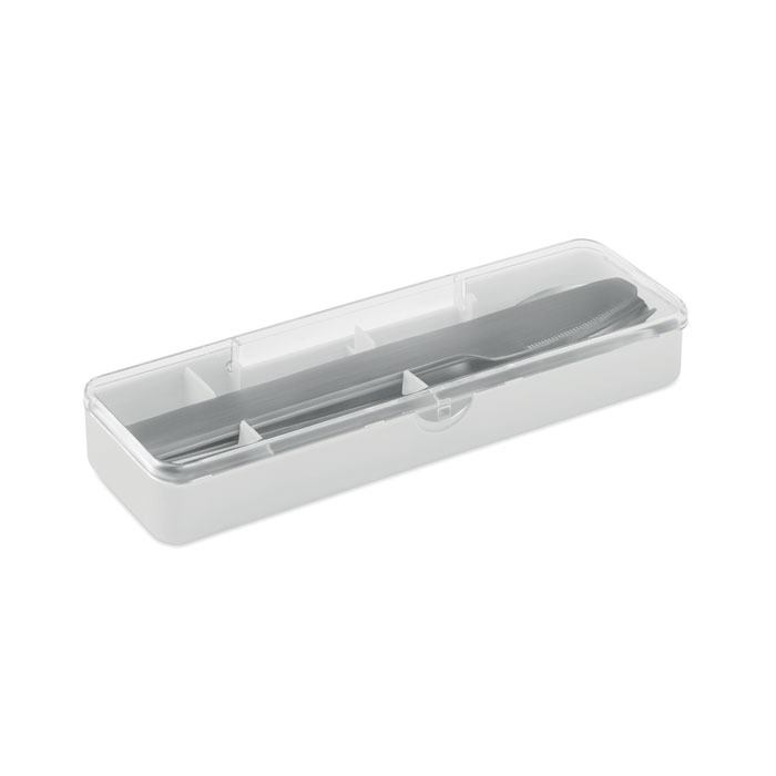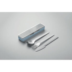 Set pribora za jelo od nehrđajućeg čelika s PP kutijom. Set uključuje vilicu, nož i žlicu.