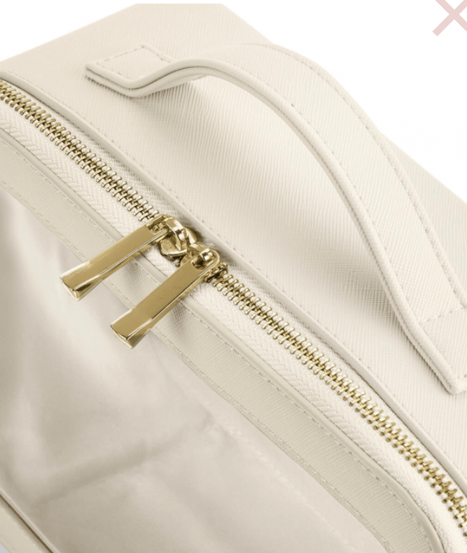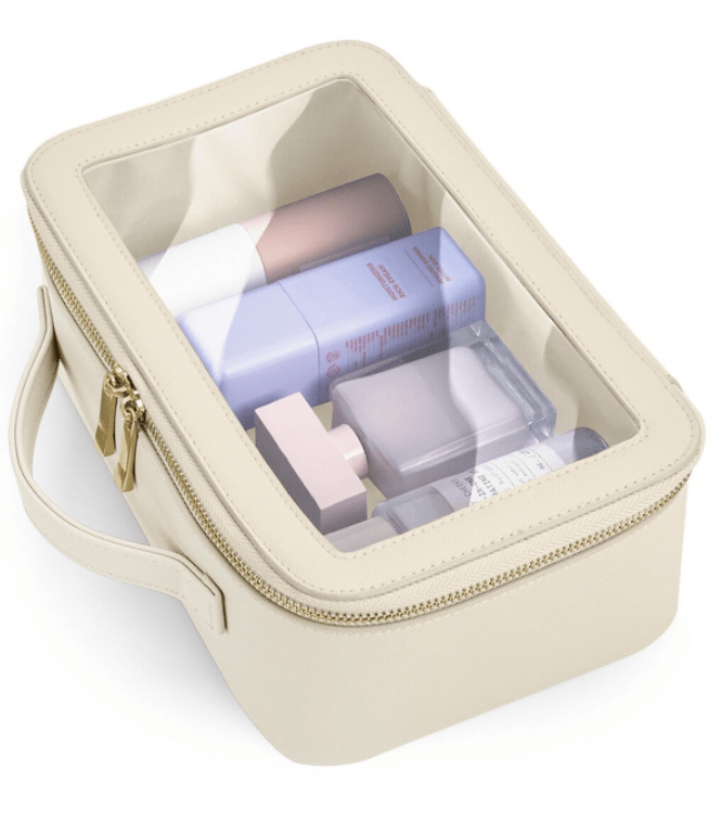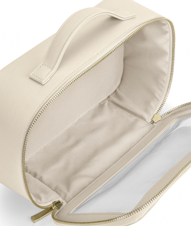 Elegantna Boutique prozirna putna torbica izrađena je od visokokvalitetnog poliuretana s izgledom kože i prepoznatljive Saffiano teksture finog zrna. Unutrašnjost je obložena mekanom podstavom, a prozirna pregledna stranica omogućuje jasan uvid u sadržaj – idealno za putovanja i organizaciju kozmetike ili dodataka. Sadrži glavni pretinac sa zlatnim metalnim patentnim zatvaračem visokog sjaja te ručku za nošenje od istog materijala. TearAway etiketa omogućuje lako brendiranje. Volumen: 3 litre. Dimenzije: 26 x 16 x 9 cm.