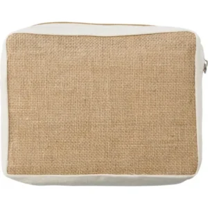 Toaletna torbica od jute s patentnim zatvaračem i prednjim džepom. Dimenzije: 20 x 6 x 15 cm
