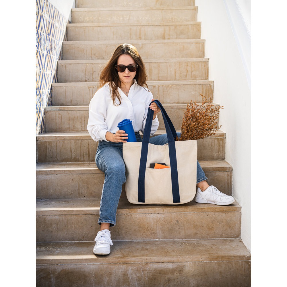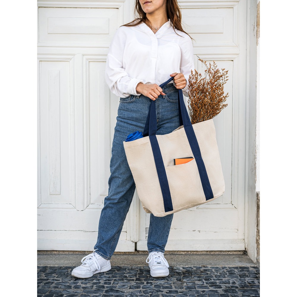 Torba od 100% pamučnog platna (280 g/m²) s prednjim džepom, unutarnjim džepom na patentni zatvarač i ručkama od 60 cm. Ova torba također ima magnetsko zatvaranje. 530 x 380 x 170 mm