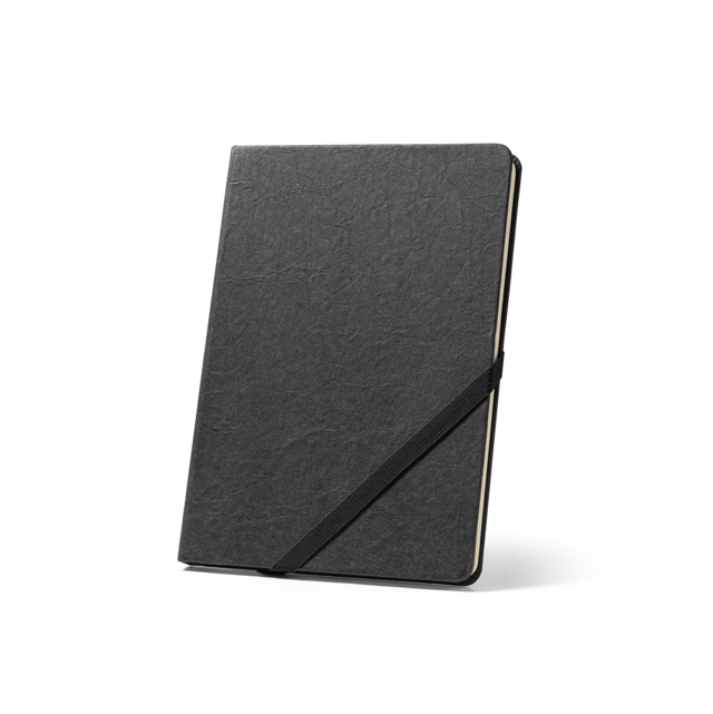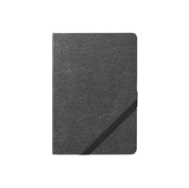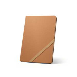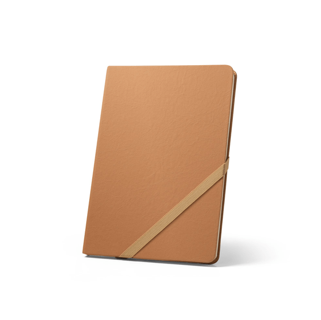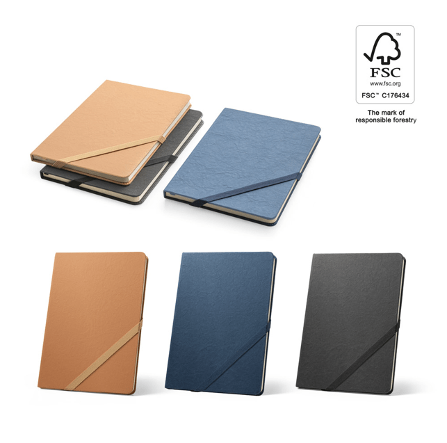 A5 bilježnica, s krutim koricama od vodootporno kraft papira i zaobljenim kutovima. Sa 160 stranica na linije (70 g/m²) na papiru boje bjelokosti izrađenom od FSC™ certificiranog materijala i drugih kontroliranih materijala, trakom za odvajanje i elastikom za zatvaranje bilježnice. 147 x 210 mm